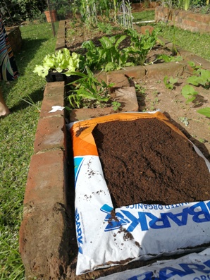 Jy benodig ‘n sak of twee (of 3) kompos en n paar sakkies saad. Maak seker dit is kompos en nie potting soil nie. Dit gaan waarskynlik nie maklik wees om sakke kompos in die hande te kry nie. Ek kon die 2 sakke by my plaaslike kruideniersware winkel koop. Dit klink of die meeste winkels wel deesdae pakkies saad verkoop. Net omdat daar tamatiesaad te koop is, sê nie dis nou die tyd om dit te plant nie. Kyk agter op die pakkie, jy wil nou saad plant wat gemerk is vir herfs of winter.