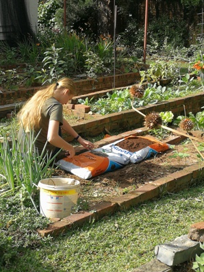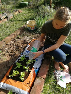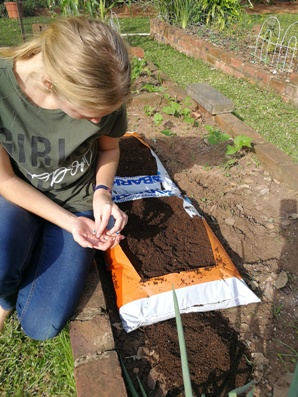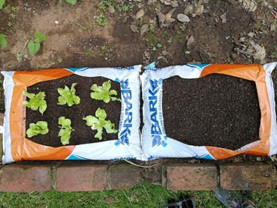 Plant saailinge of saadjies. Ons het in die eerste sak, botterblaarslaai geplant en in die tweede n mengsel baba blaarslaai soorte gesaai, wat ek hopelik in die winter met n skêr kan afsny vir ons slaai.